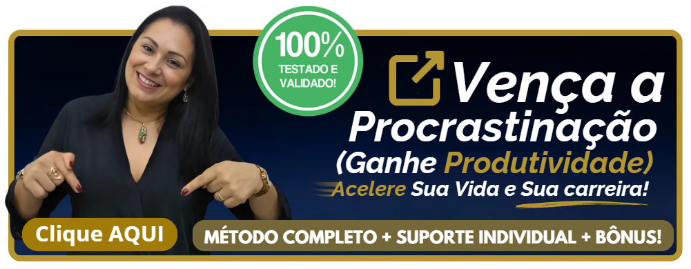 Aproveite o MEGA desconto de aniversário e entre para o Método COMPLETO e validado (Aulas passo a passo, áudios separados, material de apoio, livro completo e diagramado e suporte individual), que vai te ajudar a Vencer a Autossabotagem e a Procrastinação, Triplicar sua PRODUTIVIDADE e saber exatamente como definir, priorizar e realizar seus objetivos e metas de vida e de carreira!