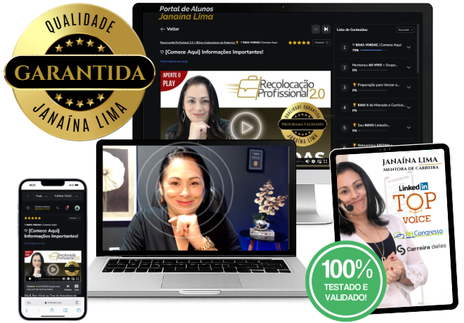 Quero que você aplique o conhecimento o mais rápido possível! Porque o nome do Jogo é RESULTADO! Por isso criei o Plano de ação de 8 semanas para você saber exatamente o que fazer e acelerar na direção do seu novo emprego. Mas o seu acesso ao Recolocação Profissional 2.0 ao meu suporte, apoio e direcionamento e todas as atualizações que eu fizer é por 12 meses e acesso 24 horas por dia para você ver e rever as aulas quantas vezes quiser do Tablet, celular ou computador e me perguntar o que quiser pelos canais exclusivos de suporte!